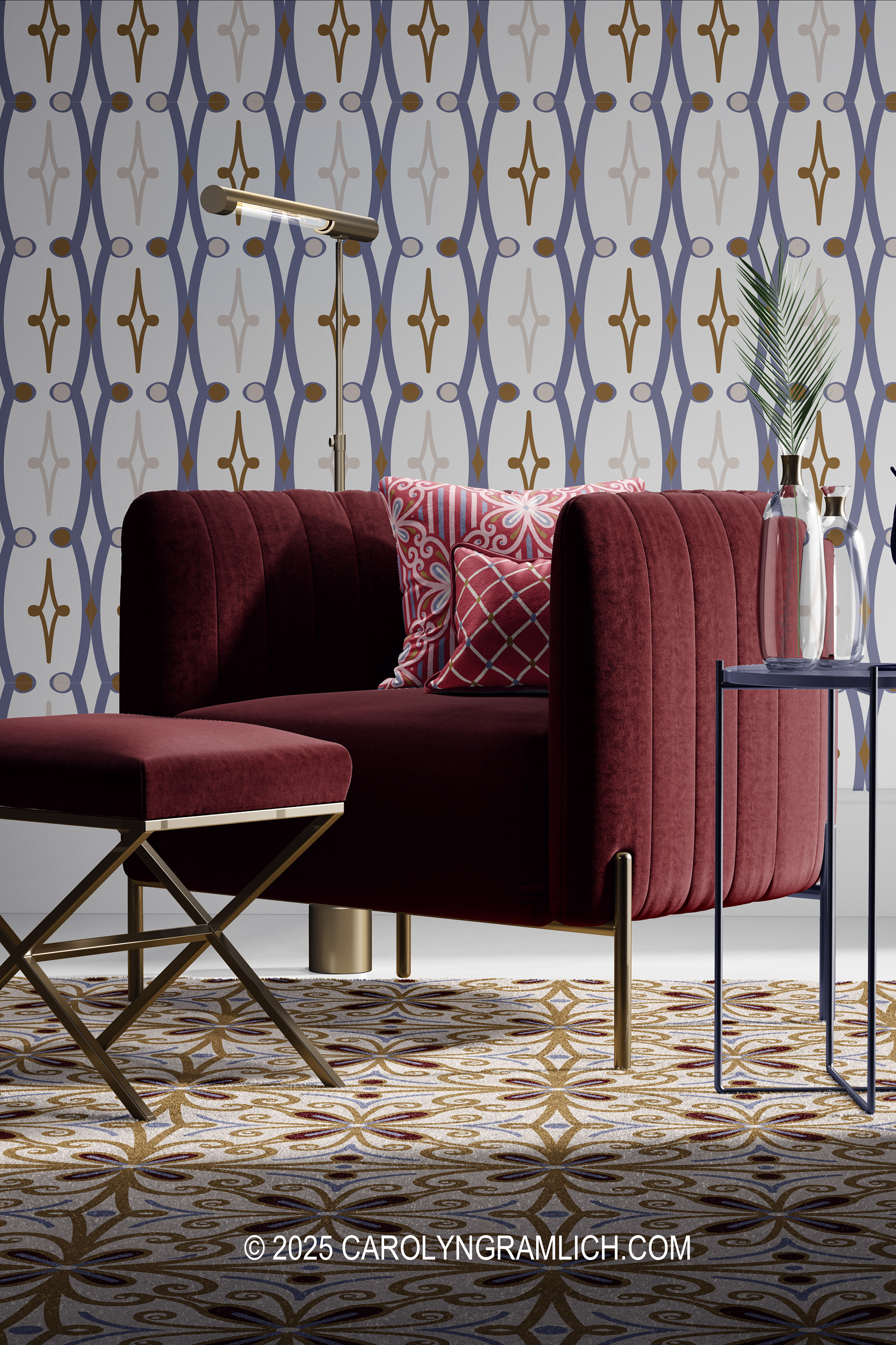 These designs are available on 30 fabric types, 6 wallpaper types and a variety of made-to-order home décor products. Sustainably printed in the US.